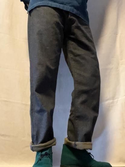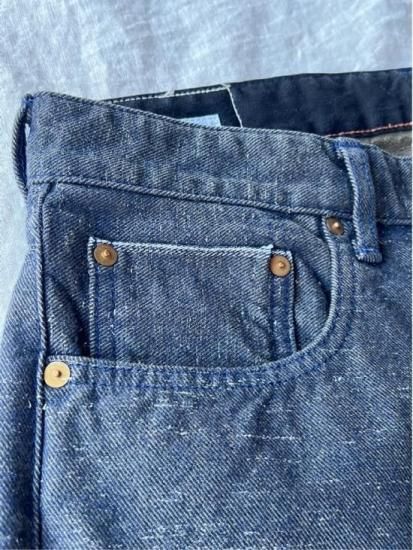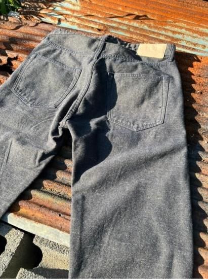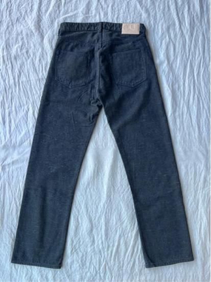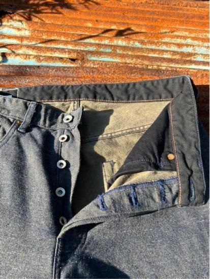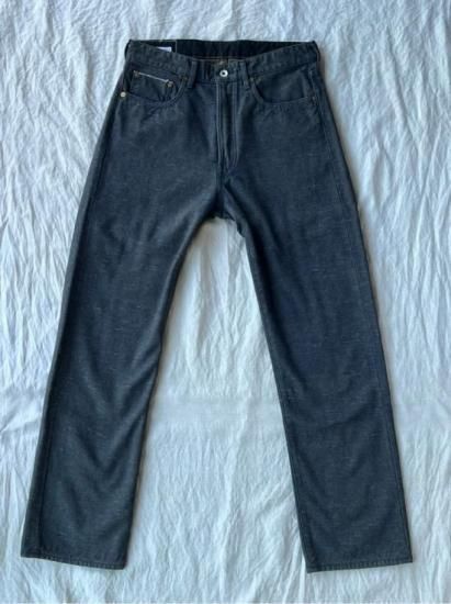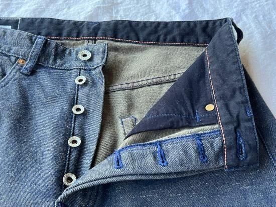 ストレートボタンフライモデル。素材は蝦夷鹿の毛とウールを混紡し織られた、オイカワデニムと岩松ファーム共同開発の13ozセルヴィッジデニム。蝦夷鹿を狩猟解体後、それまで使い道を見い出せなかった毛を6年の歳月をかけてデニムとして再利用することに成功。蝦夷鹿の毛には断熱構造と吸湿発熱による温度調整機能が備わっているため、夏でも冬でも快適に過ごせるデニム。EP-02との素材の違いは、EP-01がインディゴ染めで先染めした横糸(ウールベースに再生ナイロンを混紡したもの)に鹿毛を混紡し、EP-02は未染色のウールと鹿毛の混紡糸に更に再生ナイロンを混紡した後にインディゴ染めをしたものを使用。見た目ではEP-01が杢調で、EP-02プレーンに仕上げられている。